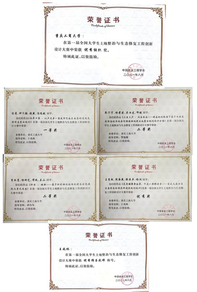 当前位置: 首页 >> 学院新闻 >> 正文 我校学子在首届全国大学生土地整治与生态修复工程创新设计大赛中喜获佳绩 时间:2021年09月07日 09:26 作者: 王兆林 8月25日,第一届全国大学生土地整治与生态修复工程创新设计大赛决赛通过腾讯会议云端举行,本次大赛由中国农业工程学会、中国地质大学(北京)共同主办,山东农业大学承办。此次大赛以“全域土地整治与乡村振兴”为主题,旨在推动我国土地整治工程相关专业的教育教学改革,培养学生的创新能力、协作精神和理论联系实际的学风,加强学生专业知识、动手能力、设计水平的训练,提高学生解决实际问题的能力,吸引、鼓励广大学生踊跃参加课外科技活动,激发学生的创新意识,为我国土整治与生态修复人才的脱颖而出提供平台。 本次大赛全国共有来自中国农业大学、中国矿业大学、中国地质大学、河海大学、长安大学等65支队伍参赛,经专家组按作品规范性、完整性、科学性、创新性与展示效果综合评审,最终确定50支队伍进入全国总决赛。决赛中,我校入围的三支队伍充分展现了扎实的专业技能和良好的团队协作能力。经过激烈角逐,来自我校土地资源管理、人文地理与城乡规划等专业组成的四支参赛队伍荣获六项奖项。王兆林老师指导,陈萌、钟溦懿等四位同学完成的作品《木犀十里·以产还乡——重庆市巴南区南泉街道迎龙村村庄整治规划》荣获总决赛村庄整治方向一等奖。鄂施璇老师指导,廖偲宇、杨孝君等四位同学完成的作品《三生三产·内生共应——村庄规划视角下基于内生发展理念的石柱县悦崃镇新城村土地整治规划设计方案》荣获总决赛全域土地整治方向二等奖。胡为为老师指导,李欣蔓、杨珩艺等四位同学完成的作品《织古·嫁新——基于织补理论的传统村落特色提取与景观再造》荣获总决赛景观规划设计方向二等奖。王兆林老师指导,吕慧敏、殷海燕等四位同学完成的作品《花香蝶舞黄金岸,千花—果醉诗乡——重庆大渡口区石盘村高标准农田建设规划设计》在此次大赛中荣获高标准农田建设方向优秀奖。同时我校荣获主办单位颁发的“优秀组织奖”荣誉称号,王兆林老师也获得“优秀指导教师奖”。 首次参加该项赛事,即斩获众多荣誉,是我校土地资源管理专业、人文地理与城乡规划专业等公共管理类专业融合发展的成果。近年来,我校公共管理类相关专业坚持融合发展,以赛促学,优势互补,在一系列全国重要专业竞赛中获得好成绩,得到了教育部公共管理教指委等专家认可,专业建设成绩斐然,2021年我校土地资源管理专业获批国家级一流本科专业建设项目,这是目前重庆市乃至全国财经类高校中唯一、一个土管国家级一流本科专业;2021年我校人文地理与城乡规划获批市级一流本科专业建设点。 通过参与此次大赛,充分展现了我校学子扎实的理论知识功底以及动手创新实践能力,也展现了我校在土地整治与生态修复等领域人才培养成绩,助力我校公共管理类相关专业国家级、市级一流本科专业建设。 。 上一条:我院召开2021级新生入学教育 下一条:我院“两基”项目及教育部项目立项总数再创历史新高 【关闭】